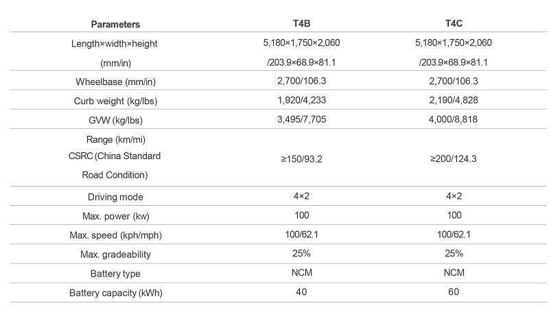 The G 6 EV T 4 is a multipurpose light duty truck that meets comprehensive business requirements such as express logistics, fruit and vegetable distribution, cold chain drugs, waste transportation and other community services